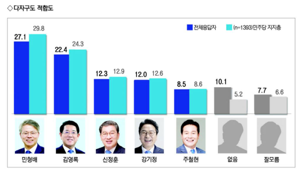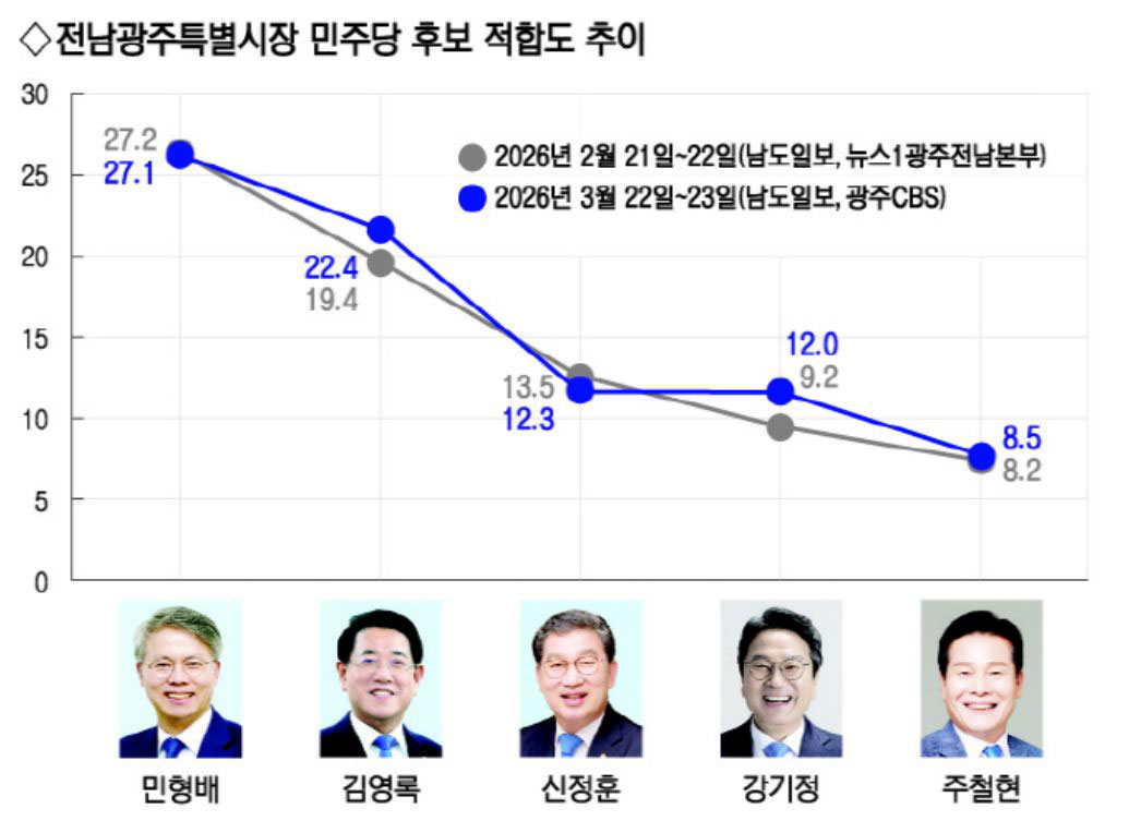 오는 6월 지방선거의 전남광주특별시장 더불어민주당 후보 적합도 조사에서 민형배 국회의원이 1위를 지킨 가운데, 김영록 전남도지사가 가파른 상승세를 보이며 격차를 좁히고 있는 것으로 나타났다.